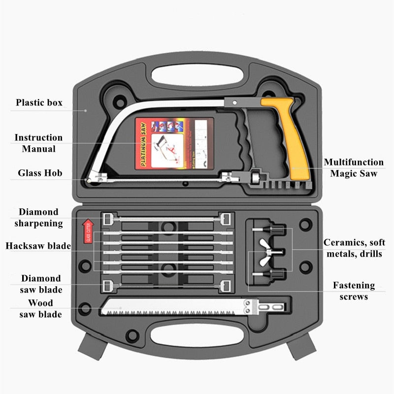 - Outil 15 en 1 avec un design unique : économisez de l'espace et de l'argent avec cet outil multifonction de taille compacte. Comptez dessus pour remplacer 15 outils, y compris la scie à métaux, le repliage, l'élagage, l'arc, le pliage et les scies manuelles, les bouteilles, le carrelage, le verre, le boulon, le tuyau en acier et les coupe-tuyaux en plastique, la scie à chaîne de ciseaux. La scie magique dispose également d'une pince à verre intégrée de 7 tailles pour être utilisée après avoir roulé le verre avec un rouleau en verre. La poignée ergonomique résiste au glissement et rend l'expérience de coupe confortable et facile.